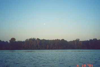 Вода прозрачна как слеза, полная луна смотрит на восходящее солнце, деревья
