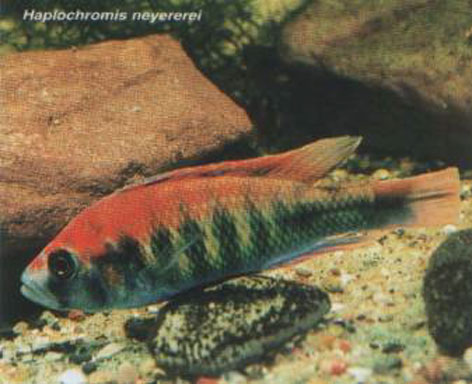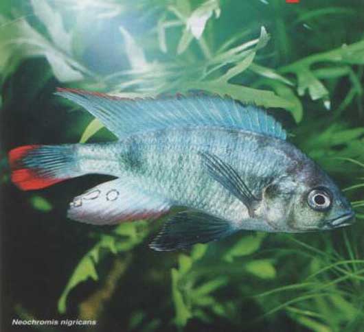 Н. (Neochromis) nigricans. Темная рыба с красноватыми плавниками. Самки, как и у большинства, серо-зеленые, за исключением мармеладно-пегой формы, самки которой красно-черные (пятнистые). Просто ослепляет своей карминной краснотой H."red short shout scraper". Красный цвет тела настолько насыщен, что местами кажется черным.