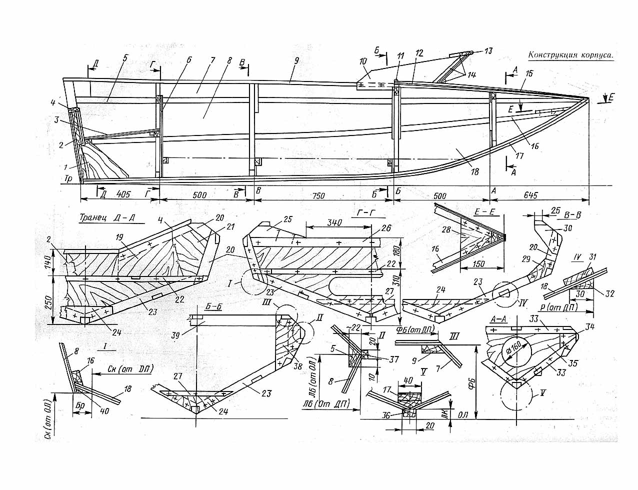 Конструкцию корпуса старался сделать как можно проще, в расчете на обшивку его строительной фанерой толщиной 5 мм. Поперечный набор составили транец и три шпангоута, собранных из реек 50Х16 мм. Киль склеил из двух реек 40Х10 мм. Между транцем и шп.Г сделал самоотливной рецесс, носовую часть защитил от заливания палубой и наклонным козырьком. Корпус был собран на гвоздях с применением эпоксидной смолы, снаружи оклеен слоем стеклоткани, Вес лодки составил 45 кг.
