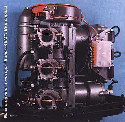 электронного зажигания. Сбоку на картере крепятся три карбюратора совместно