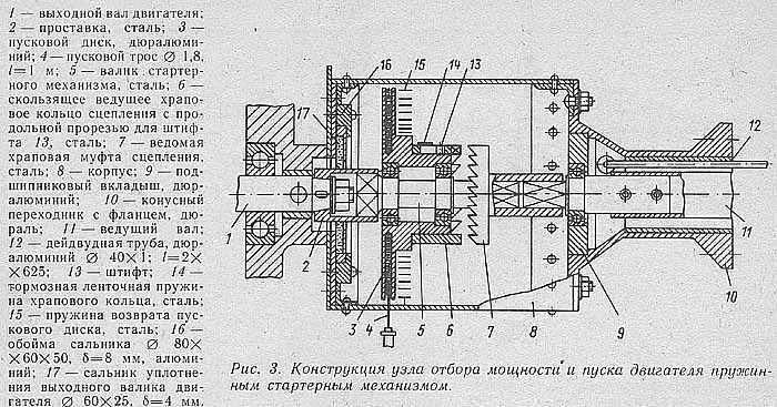 устройства. Ручной стартерный механизм имеет диск 3, в прорези которого