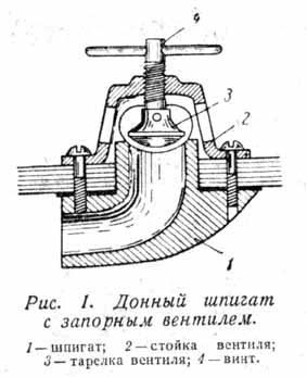 На ходу моторные лодки всегда имеют дифферент на корму и трюмная вода скапливается у транца. Именно здесь и устраивают донные отливные шпигаты. Роль пластинки, образующей пустоту, выполняет короткий патрубок, обращенный открытым концом в корму. Для уменьшения сопротивления патрубку придается обтекаемая форма. Второе (входное) отверстие выходит внутрь лодки и снабжается надежной завинчивающейся пробкой, запорным вентилем, открывать которые следует только при скорости свыше 10 км/час или же на берегу. (см. рис. 1)