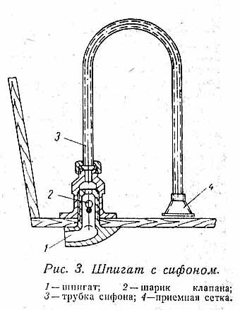Шпигат с сифоном действует "автоматически" (см. рис. 3) . На стоянке труба сифона должна быть поднята выше ватерлинии лодки, чтобы не произошло обратного заливания трюма. Поступлению забортной воды на заднем ходу препятствует простейший шариковый клапан, а засорению сифона_ сетка на его приемном конце.