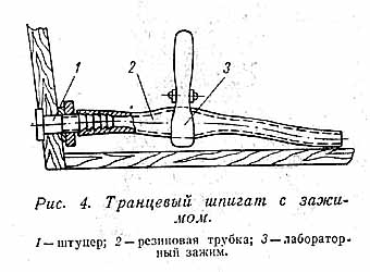 На глиссирующих мотолодках, транец которых на ходу полностью осушается, можно устанавливать транцевые шпигаты. В простейшем виде это отверстия, облицованные бронзовыми или пластмассовыми втулками и снабженные завинчивающимися пробками. На рис. 4 показан шпигат с резиновым шлангом, который перекрывается обычным лабораторным зажимом.
