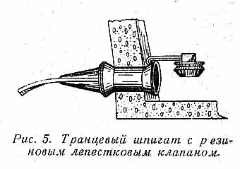 Шпигат на рис. 5 снабжен резиновым невозвратным клапаном лепесткового типа, подобным дыхательному клапану маски противогаза, и запорной конусной пробкой. Могут быть применены и другие, более сложные конструкции невозвратных клапанов, в том числе и управляемые с места рулевого.